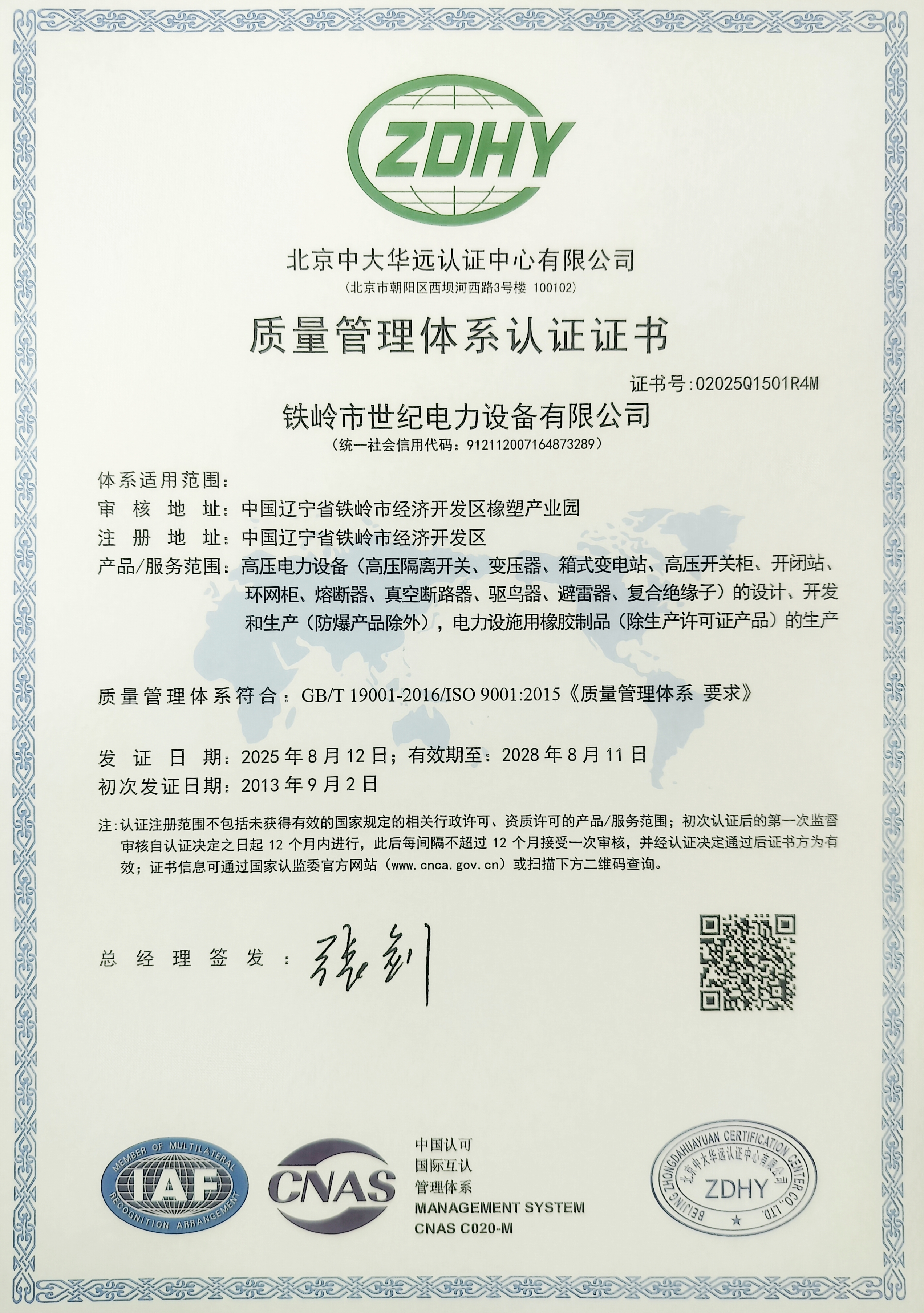 鐵嶺市世紀(jì)電力設(shè)備有限公司是集科研開發(fā)、生產(chǎn)制造、用戶服務(wù)于一體的國(guó)家高新技術(shù)企業(yè),始建于1999年,位于鐵嶺經(jīng)濟(jì)開發(fā)區(qū),占地面積5萬(wàn)余平方米,建筑面積2萬(wàn)余平方米。主要從事國(guó)家電網(wǎng)配套戶外高低壓隔離開關(guān)、電力電纜、變壓器成套裝置、高低壓開關(guān)柜、箱式變電站、絕緣子等產(chǎn)品的研發(fā)、生產(chǎn)和銷售。公司現(xiàn)有國(guó)家發(fā)明專利6項(xiàng)、實(shí)用新型專利9項(xiàng),公司通過(guò)了ISO9001國(guó)際質(zhì)量管理體系認(rèn)證、ISO14001環(huán)境管理體系認(rèn)證和ISO 45001職業(yè)健康安全體系認(rèn)證。